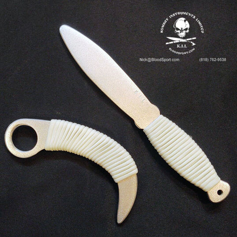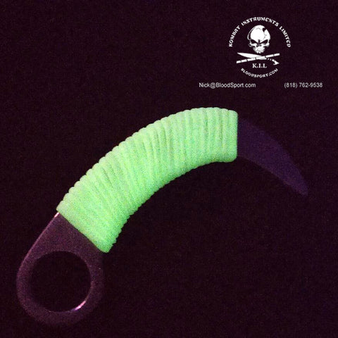 KIL brings you our new Zombie Glow Aluminum Trainers - the training knives that glow in the dark!!!  We have taken our most popular trainers, our Double Edge Knife & our Karambit, and wrapped the handles with "Glow in the Dark" 550 Paracord.  Easy to find your weapon in the darkness.  Fun for all ages!!!